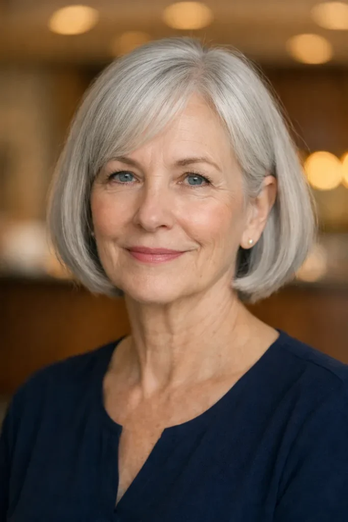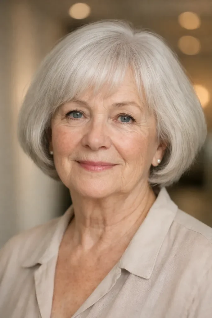 This chin-length silver bob has a smooth rounded shape that keeps the ends looking neat and full. The side-swept fringe softens the forehead area, and the bright silver tone makes the whole cut look clean, polished, and easy to wear every day.