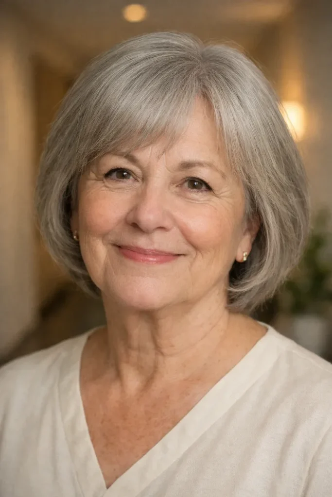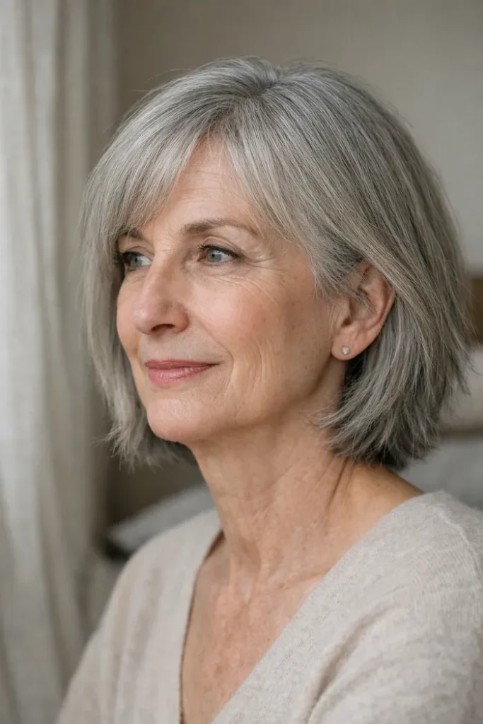 This soft gray midi cut sits between chin and shoulder length with the ends gently turned under. That slight curve makes the shape look fuller and more controlled, while the side fringe helps the style frame the face without looking stiff.