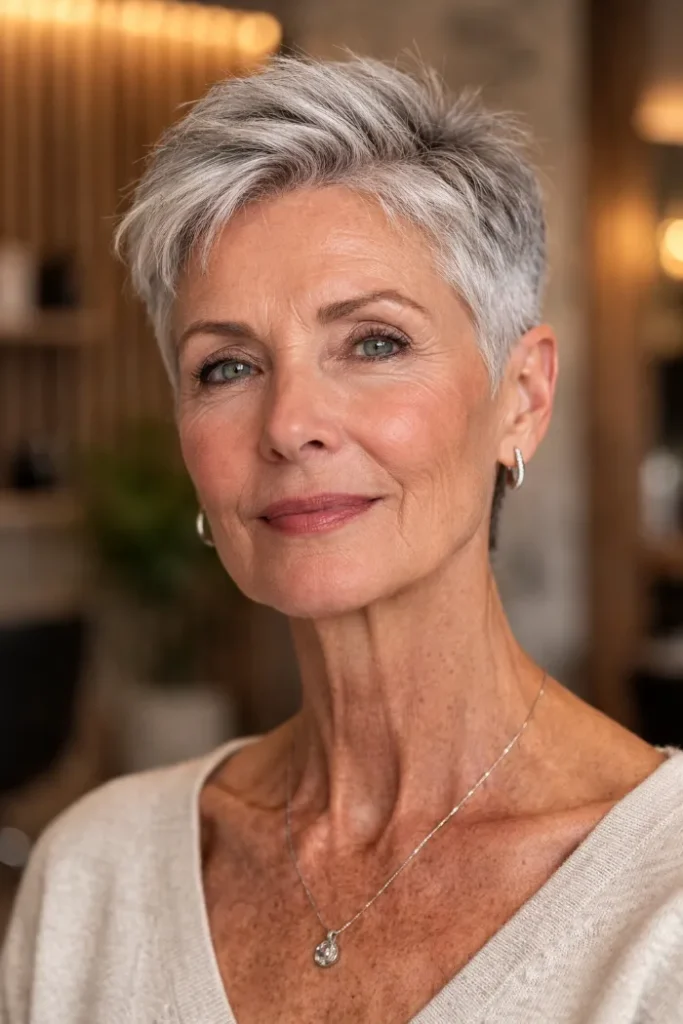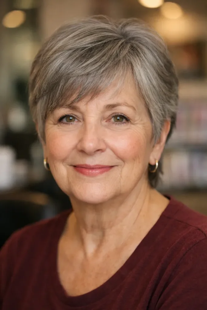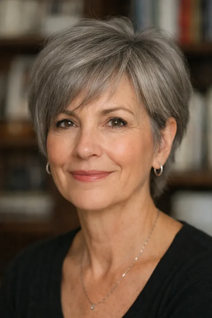 This side-swept gray pixie has a longer top that gives it shape and softness through the front. The shorter sides keep it neat around the ears, while the side fringe helps the cut feel balanced instead of cropped too close.