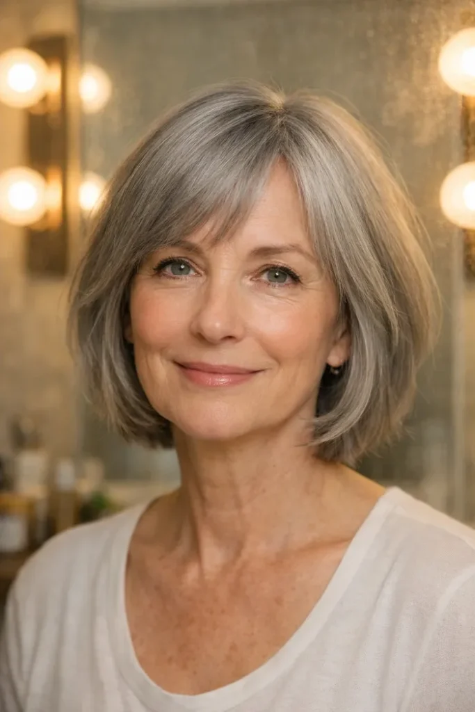 Blunt bobs, rounded bobs, stacked shapes, and cuts with light crown layers can help gray hair look fuller. These shapes keep more weight in the right places, which helps if your hair has become finer over time.