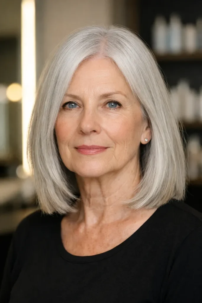 Ask for a blunt lob with minimal layering, a center part, and a sleek finish. Use a flat iron for a smooth line, then apply a light shine serum to keep the silver looking bright.