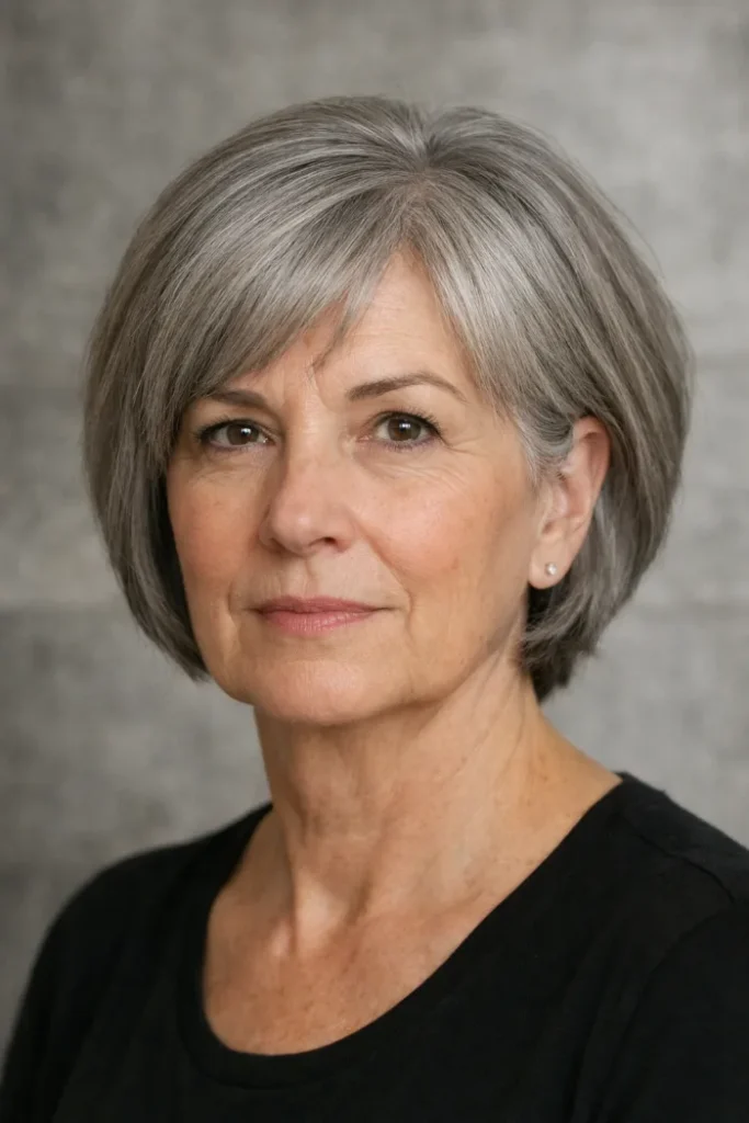 This stacked gray bob has a fuller shape through the back, which gives the cut natural lift without much styling. The side-swept front softens the face, and the rounded outline keeps the whole shape looking neat and structured.