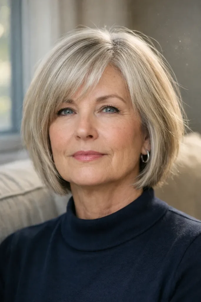 This is a classic bob that still feels fresh because of the side-swept fringe and gentle layering. It frames the eyes and softens the forehead without looking heavy. Keep the ends blunt-ish for fullness. A light smoothing cream keeps flyaways down.